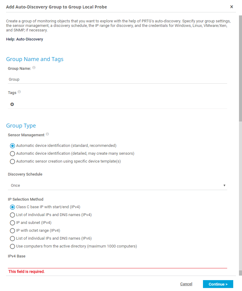 - Select Devices | Add Auto-Discovery Group from the main menu bar. To start an automatic detection of devices and sensors in your network an assistant will appear, leading you through two steps.