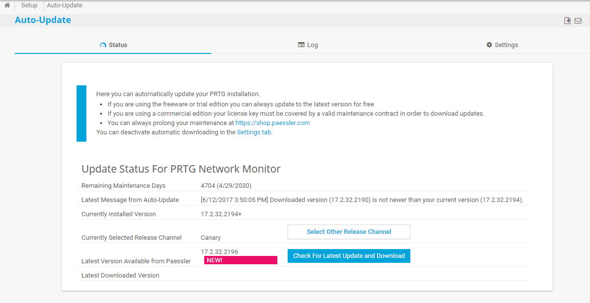 To view the auto-update page of your PRTG installation, select Setup | Auto-Update from main menu. On the Status tab, you can download and perform updates.
