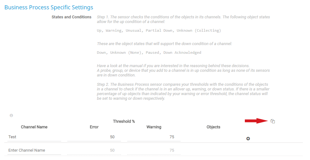 If you encounter issues with your Business Process sensor and want to contact our support team, please send us your exact configuration. It helps us find the cause more easily and quickly. Click the little clipboard icon in the upper-right of the Business Process Specific Settings table to copy your configuration: