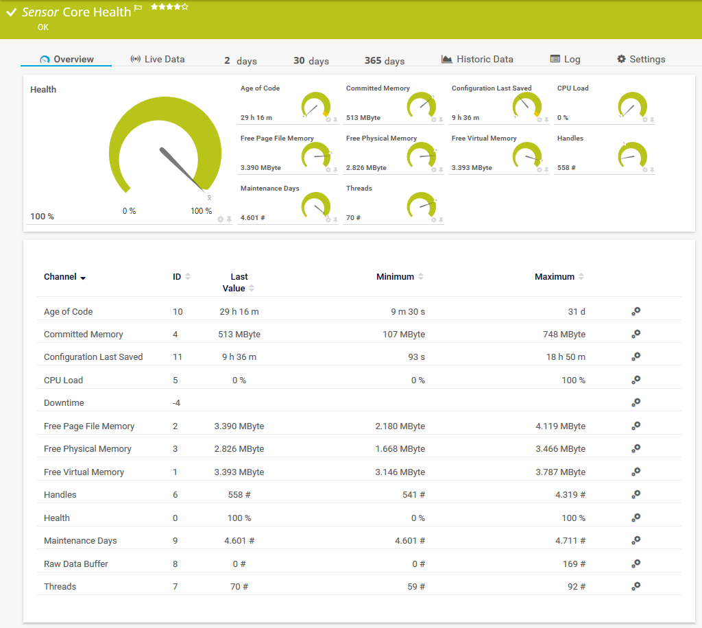 The Core Health sensor monitors internal PRTG parameters. It shows the status of the PRTG core server.
