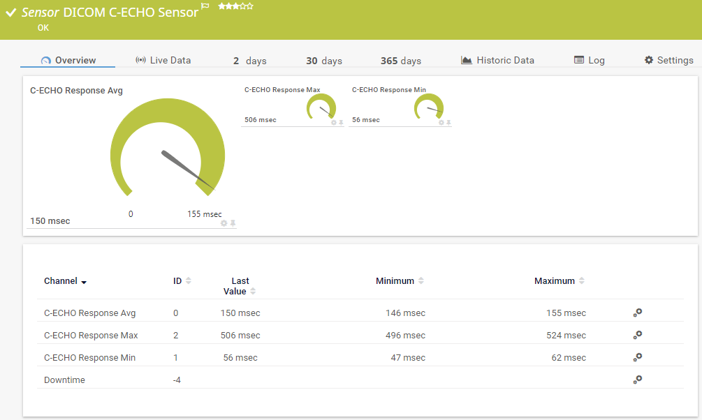 The DICOM C-ECHO sensor monitors the availability of DICOM capable systems and devices by sending C-ECHO requests to the target system. C-ECHO is also known as DICOM-Ping. You can use the sensor to verify that the DICOM handshake is executed and that your target system is capable of answering DICOM messages.