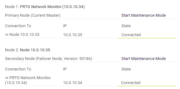 In two browser windows, log in to the PRTG web interfaces of both of your PRTG installations. Open the cluster status page in both windows by clicking on the narrow cluster information bars at the top of each window. You should see a cluster status with your two nodes in a Connected state after a few minutes.