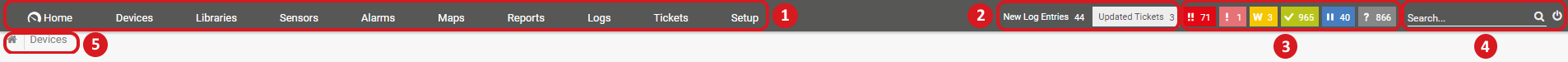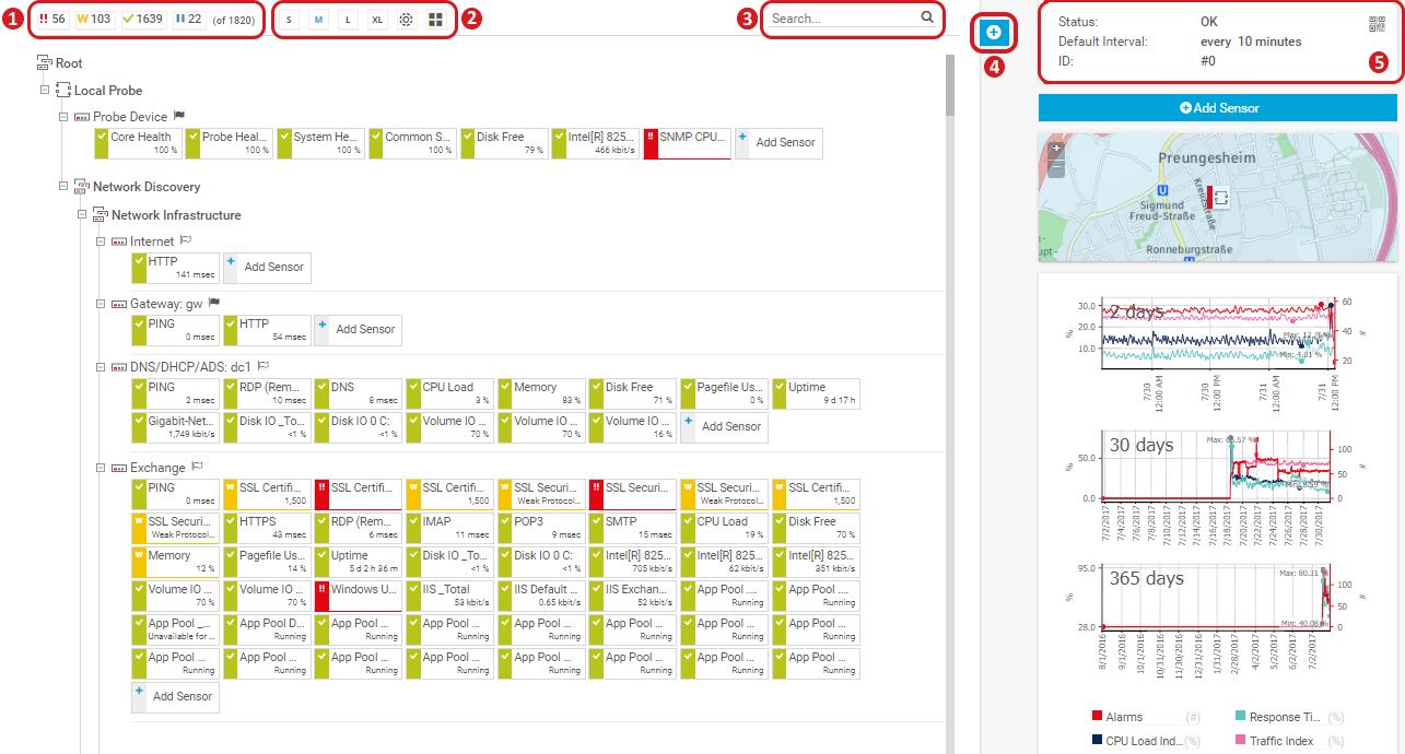 These navigation paths offer complete access to the functionality of PRTG, often you will find multiple means of accessing information or navigating to a certain setting.
