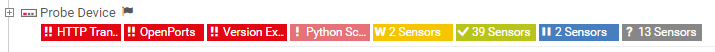 In the classic device tree view you can collapse devices, groups, and probes. Click the minus box left of the object name. The sensor states will then be summarized. The states of all sensors on this object will be displayed. Right next to the status, the amount of sensors in this status will be displayed, with the exception of the states Down, Down (Partial), and Down (Acknowledged). In the default settings, the sensors will be grouped together if there are more than ten sensors with the same status, otherwise they will be displayed individually.
