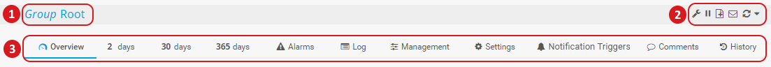 This line displays the current object's type and name as page heading. In the screenshot above, it is a group that is called Root. Here you can define the object's priority by clicking on one of the five stars (not available for the Root group). For details, see section Priority and Favorites.