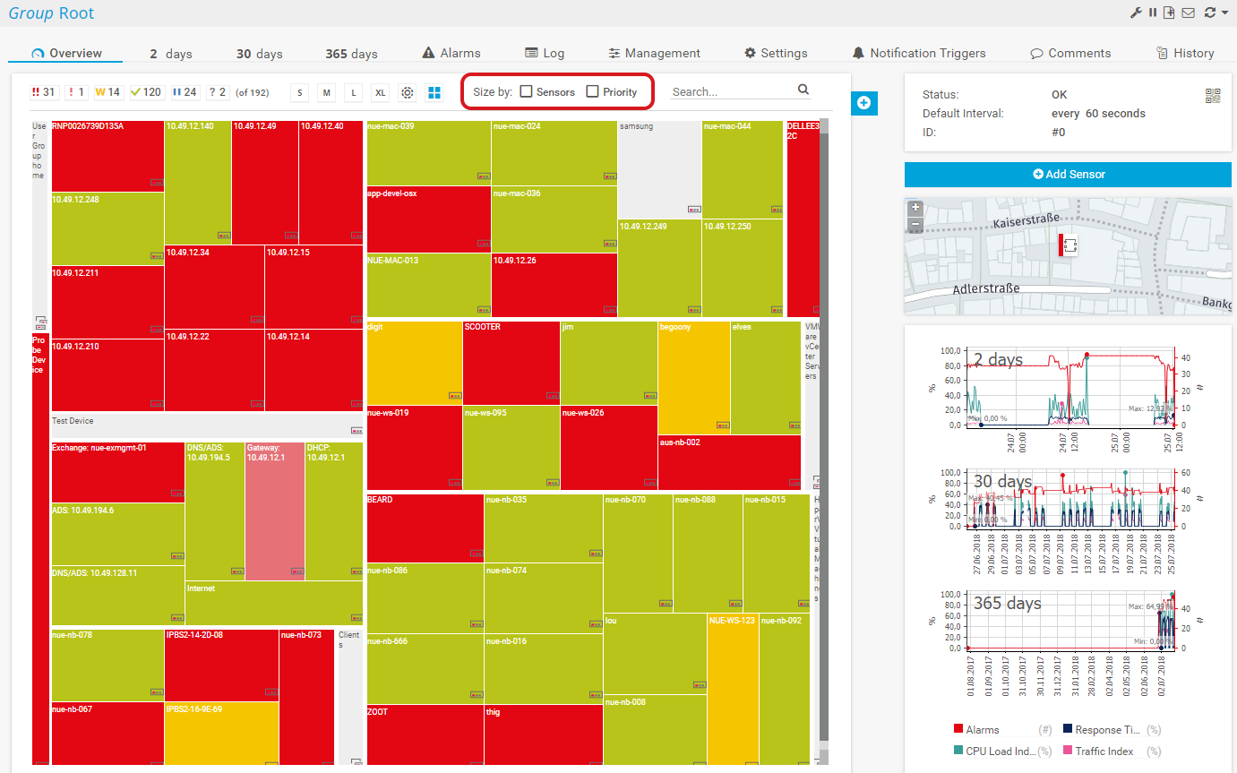 The tree map view displays all devices of your entire installation as tiles sorted into a square and arranged according to the groups they belong to. Each device dynamically changes color to reflect the overall status of the sensors on the device. You can also adjust the square size: either depending on a device's priority, or depending on the number of sensors on a device, or depending on both. To do this, click the Size by: Sensors and/or Priority setting in the page header bar (see the mark in the screenshot below).