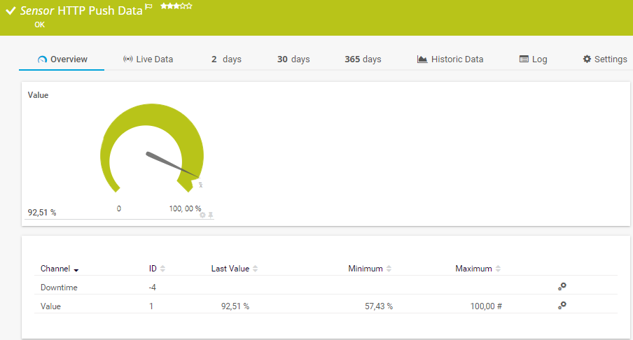 The HTTP Push Data sensor displays numerical values from received messages that are pushed via a Hypertext Transfer Protocol (HTTP) request to PRTG. It provides a URL that you can use to push messages to the PRTG probe system via HTTP (insecure or TLS 1.2 encrypted).