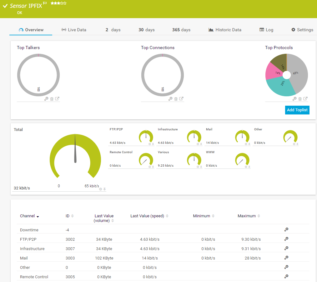 For all flow and packet sniffer sensors there are Toplists available on the Overview tab of a sensor's detail page. Using Toplists, you can review traffic data of small time periods in great detail.