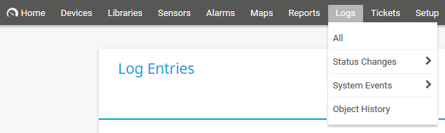 Open a list with log information for certain status changes only. Hover over Status Changes to show other menu items. Follow the menu path to view log entries with a special value in the Status field only. Select between Up & Down (shows entries with either Up or Down in the Status field), Down, Warning, Unusual, Up, Paused/Resumed (shows entries with either Paused or Resumed in the Status field), or Acknowledged Alarms.
