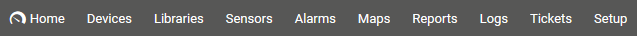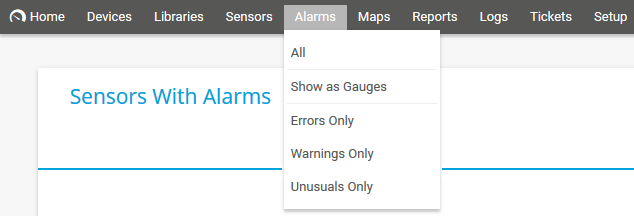 Click to show all sensors that currently show a Down, Down (Partial), Warning, or Unusual status. In the table list that appears, you can re-sort the items by clicking the column's header items. If you select Show as Gauges, this command displays the sensor gauges in a size corresponding to their priority. Hover over Alarms to show other menu items.
