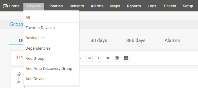 Click to show a group view of all your devices, starting with the Root group, which contains all other groups of your setup. Hover over Devices to show other menu items.
