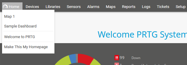 Click to open the user's homepage. The default setting is the PRTG welcome page. You can change the homepage in the user account settings. Point to Home to show other menu items.