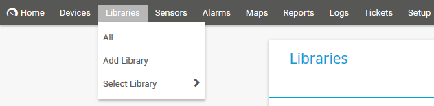 Click to open the Libraries overview list where you can view or add custom views of your network status and monitoring data. Hover over Libraries to show other menu items.