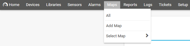 Click to open the Maps overview page where you can view or add custom views of your network status and monitoring data. Hover over Maps to show other menu items.