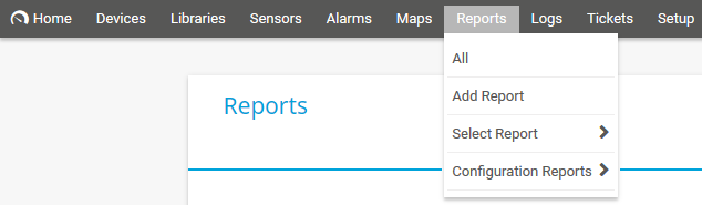 Click to open the Reports overview page where you can view or add reports of your monitoring data. Hover over Reports to show other menu items.