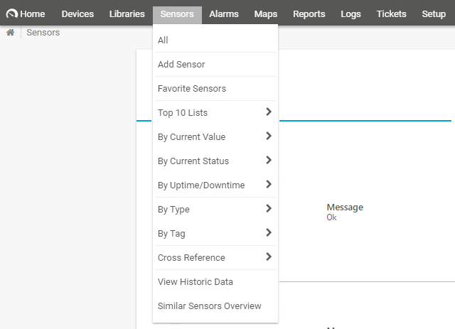 Open a list of sensors filtered by different parameters. Hover over By Uptime/Downtime to show other menu items. Follow the menu path to view table lists of all sensors sorted by