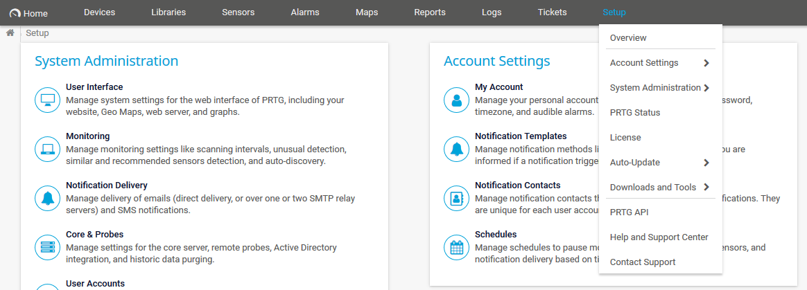 This documentation refers to the PRTG System Administrator user accessing the PRTG web interface on a master node. If you use other user accounts, interfaces, or nodes, you might not see all of the options in the way described here. If you use a cluster installation, note that failover nodes are read-only by default.