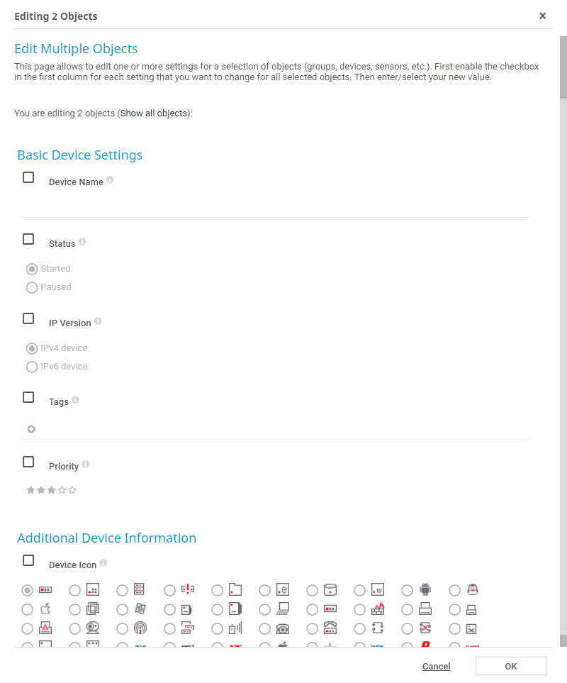 The Edit Multiple Objects dialog box shows most of the settings that the selected sensors respective devices have in common. For example, you can edit the name, tags, priority, scanning interval, and access rights.