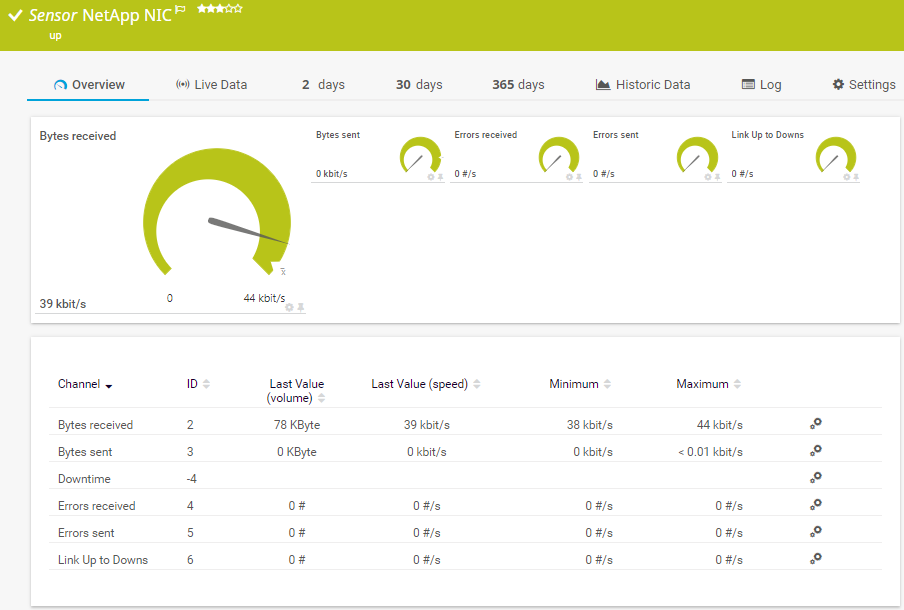 The NetApp NIC sensor monitors the network interface controller (NIC) of a NetApp cDOT or ONTAP cluster accessing the Application Programming Interface (API) via Simple Object Access Protocol (SOAP). It can show the following: