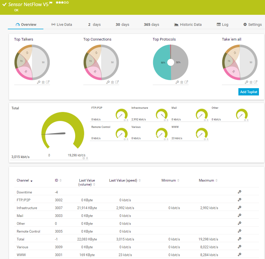 For all flow and packet sniffer sensors there are Toplists available on the Overview tab of a sensor's detail page. Using Toplists, you can review traffic data of small time periods in great detail.