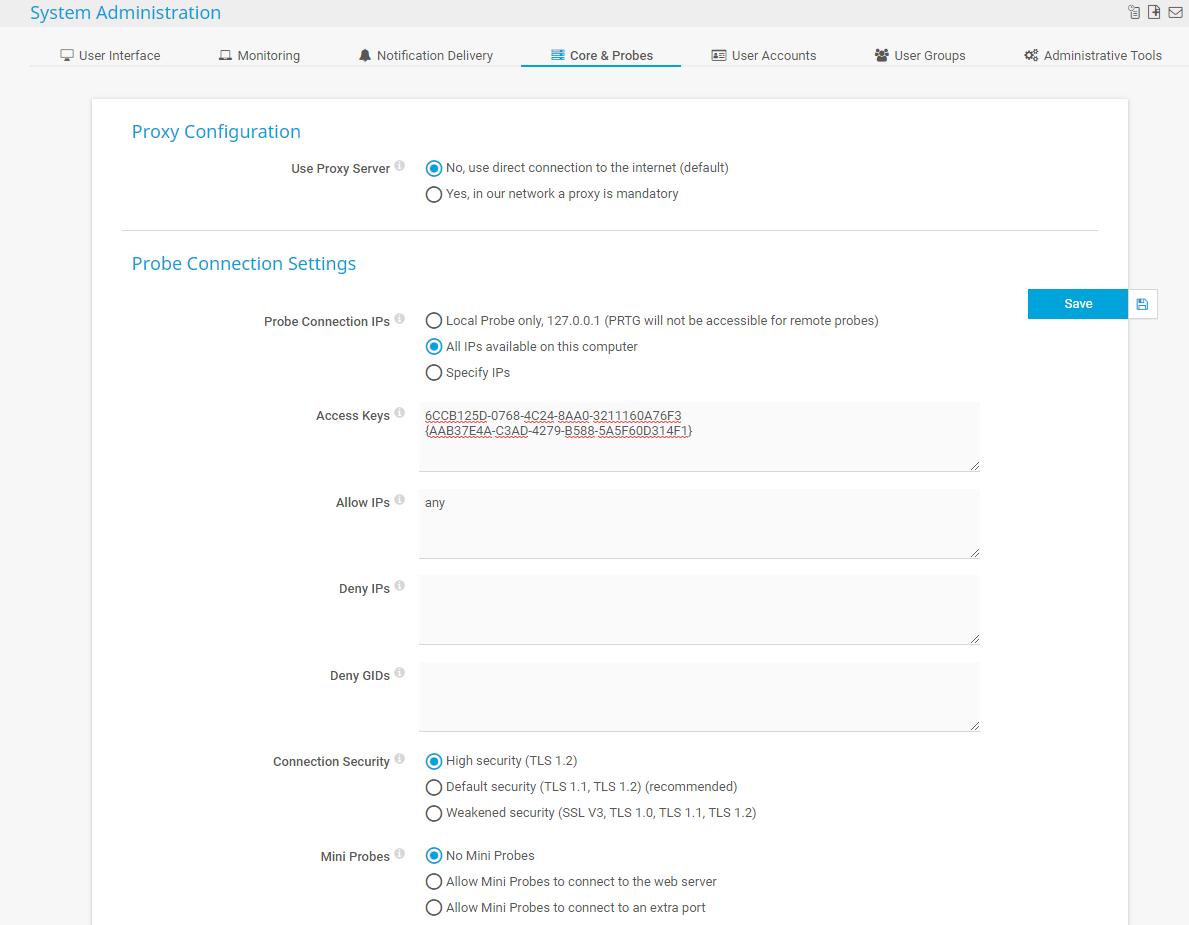 Edit the relevant settings in System Administration—Core & Probes. From the main menu in the PRTG web interface, select Setup | System Administration | Core & Probes to access the probes settings and go to the Probe Connection Settings.