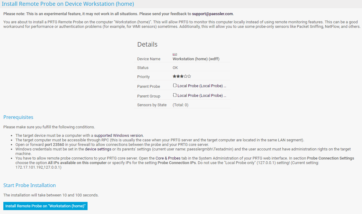 - Please note that installing a remote probe directly from the device tree in the PRTG web interface is an experimental feature. It may be the case that this approach is not possible in all situations.