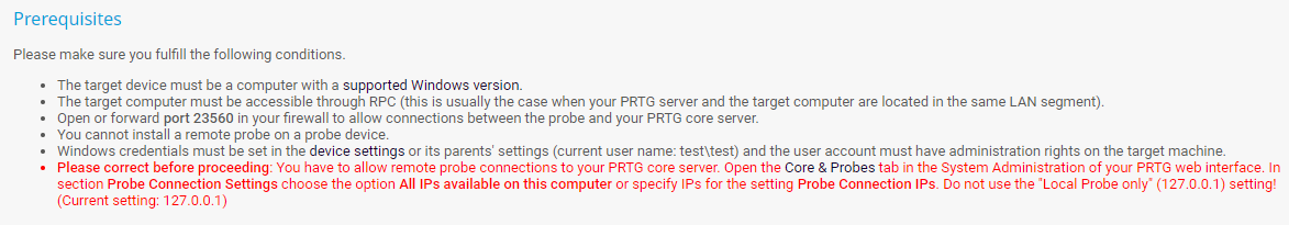 If you have not yet done so, add a device to PRTG that represents the target computer on which you want to install the remote probe. Set the correct Windows credentials for this device.