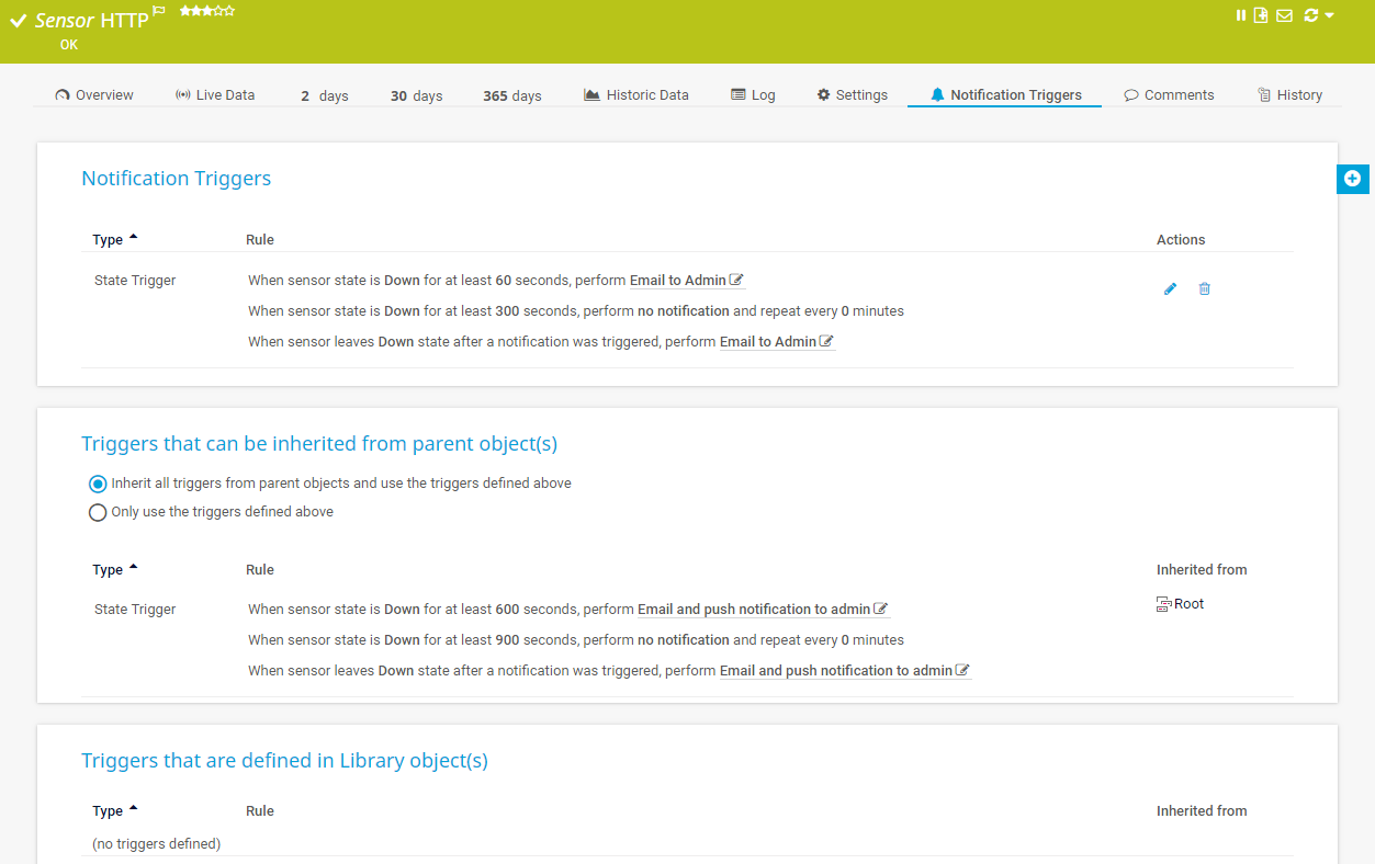 Although the sensors activate a notification trigger, you can set notification triggers higher in the hierarchy (for example, for groups or devices). Because of this you can define notification triggers for multiple sensors using the inheritance mechanism. Monitoring objects with inherited notification triggers show these in section Triggers That Can Be Inherited From Parent Object(s) on the Notification Triggers tab.
