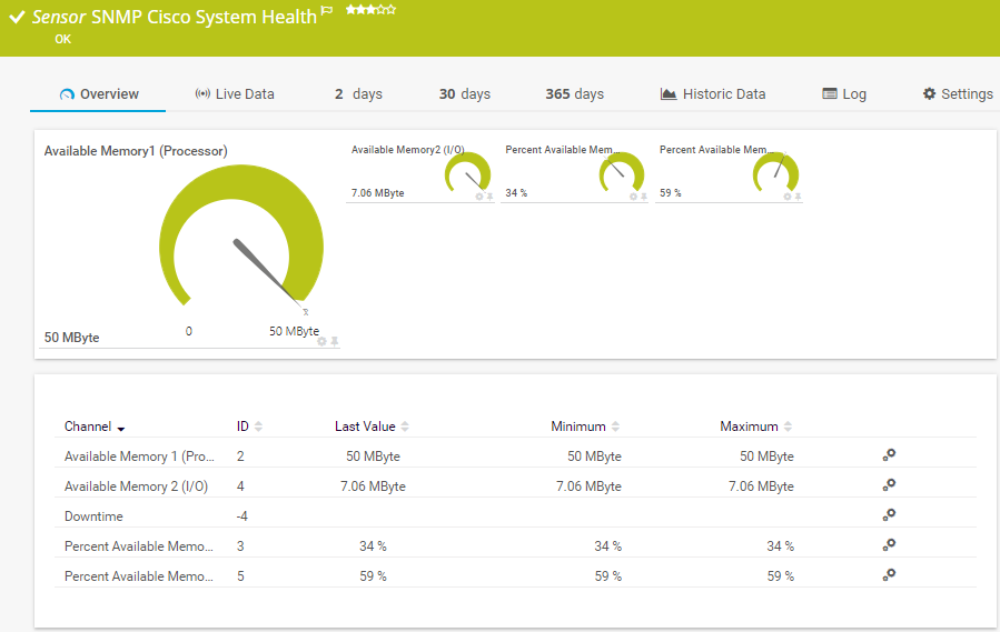 The SNMP Cisco System Health sensor monitors the system health of a Cisco device via Simple Network Management Protocol (SNMP).