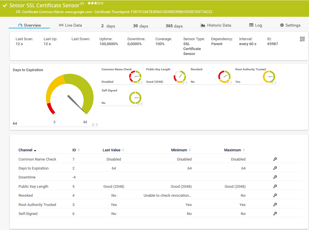 The SSL Certificate sensor monitors the certificate of a secure Secure Sockets Layer (SSL)/Transport Layer Security (TLS) connection. It can show the following: