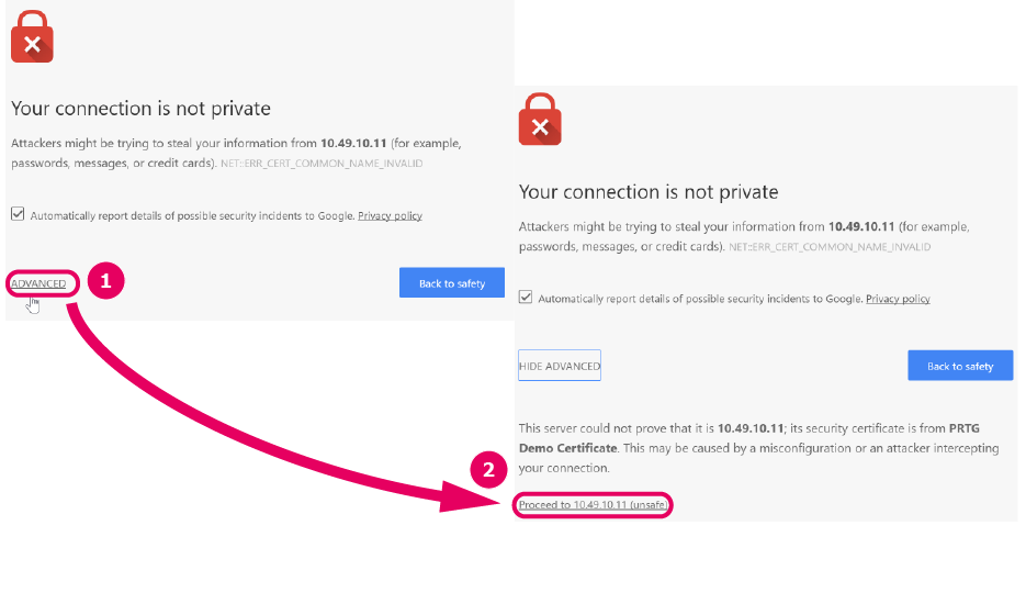 In Google Chrome, click Advanced and then Proceed to [yourPRTGserver] (unsafe) every time you call the PRTG web interface.