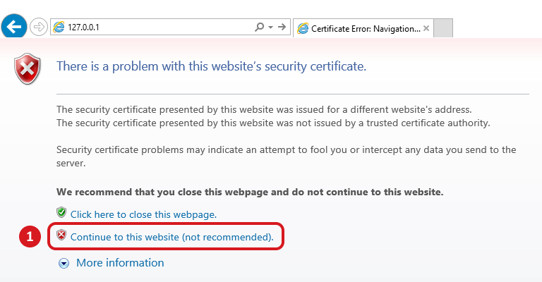 In Internet Explorer, click Continue to this website (not recommended) every time you call the web interface.