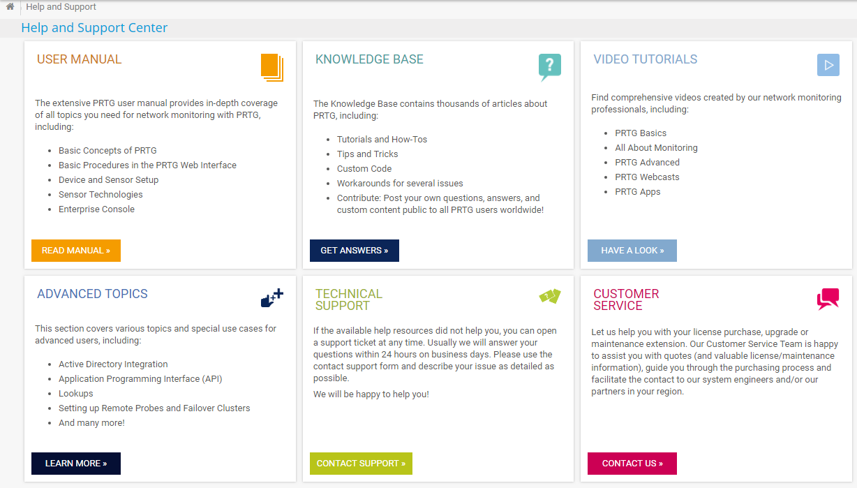 The Help and Support Center of your PRTG installation is where you can access the PRTG user manual, the Knowledge Base, and video tutorials. You can also open support tickets and contact our customer service from this page.