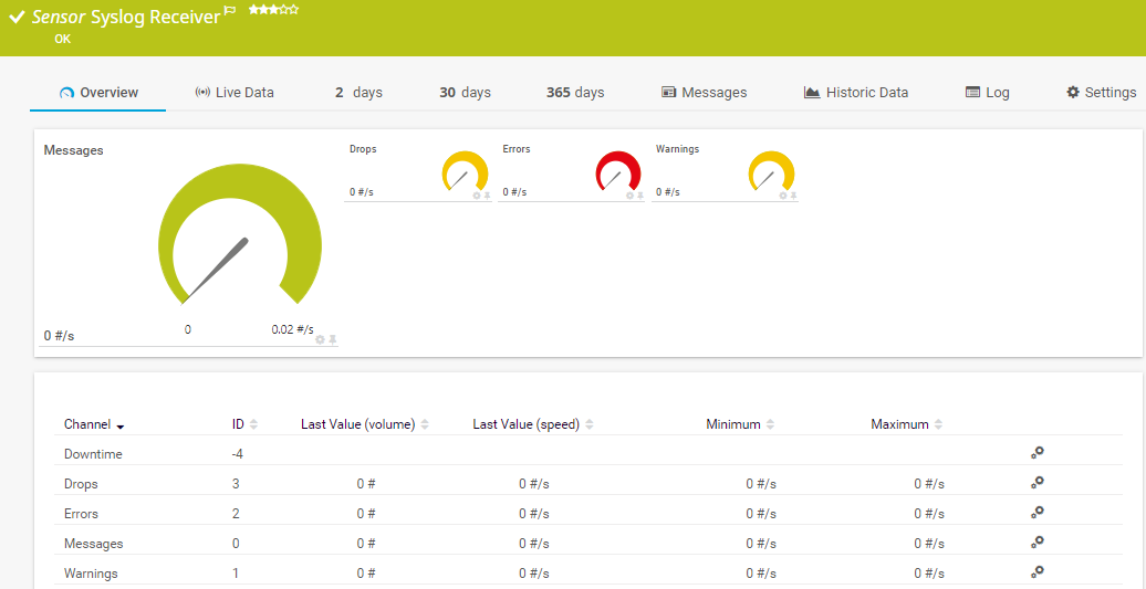 PRTG stores received Syslog messages as common files in the data folder (see section Data Storage). To review and analyze all received messages, you can access the most recent data directly in a table list in the PRTG web interface. You can access this list via the Overview tab of the sensors.
