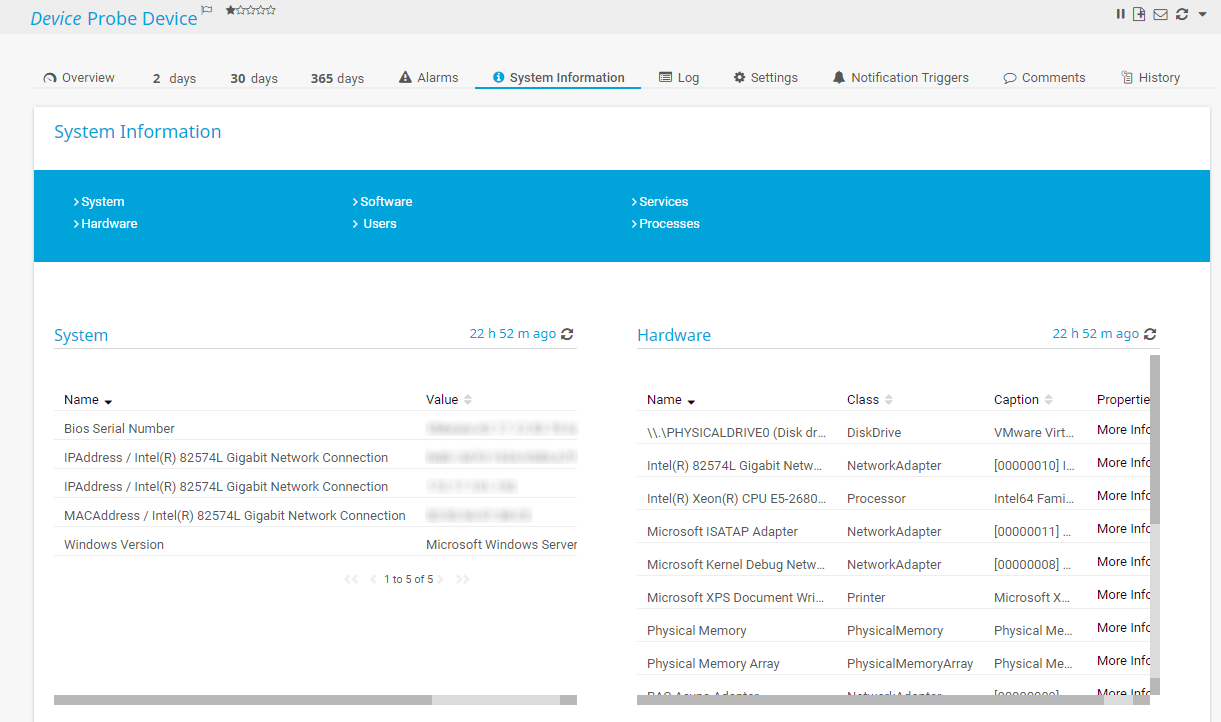 PRTG automatically retrieves data for all tables, including System, Hardware, and Software, once every 24 hours. The tables Users, Services, and Processes refresh each time you open the System Information tab. PRTG also updates all system information tables when the PRTG server is restarted, for example, after an update.