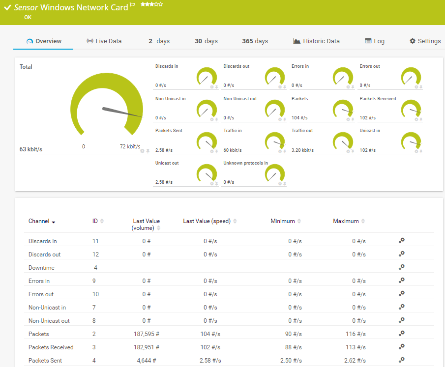 The Windows Network Card sensor monitors bandwidth usage and traffic of a network interface using Windows Management Instrumentation (WMI) or Windows Performance Counters, as configured in the "Windows Compatibility Options" of the parent device.